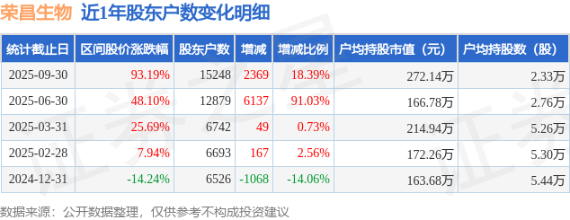 从股价来看,2025年6月30日至2025年9月30日,荣昌生物区间涨幅为93.19%,在此期间股东户数增加2369.0户,增幅为18.39%。