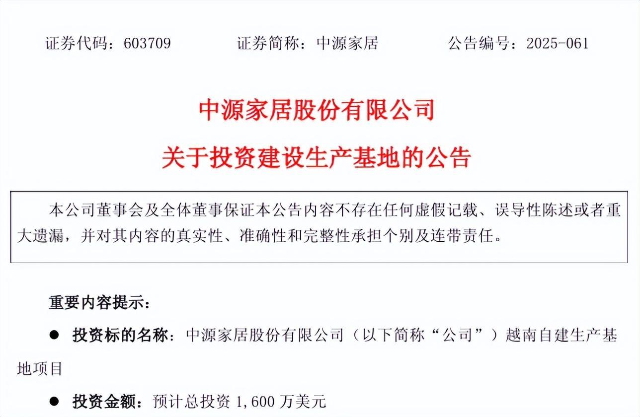 11月7日,中源家居发布公告称,拟出资1600万美元投资建设越南生产基地项目。投资总额将用于越南生产基地项目产能建设、业务发展所必须的生产经营活动,包括但不限于购置土地、建造厂房及附属设施、购置机器设备等。