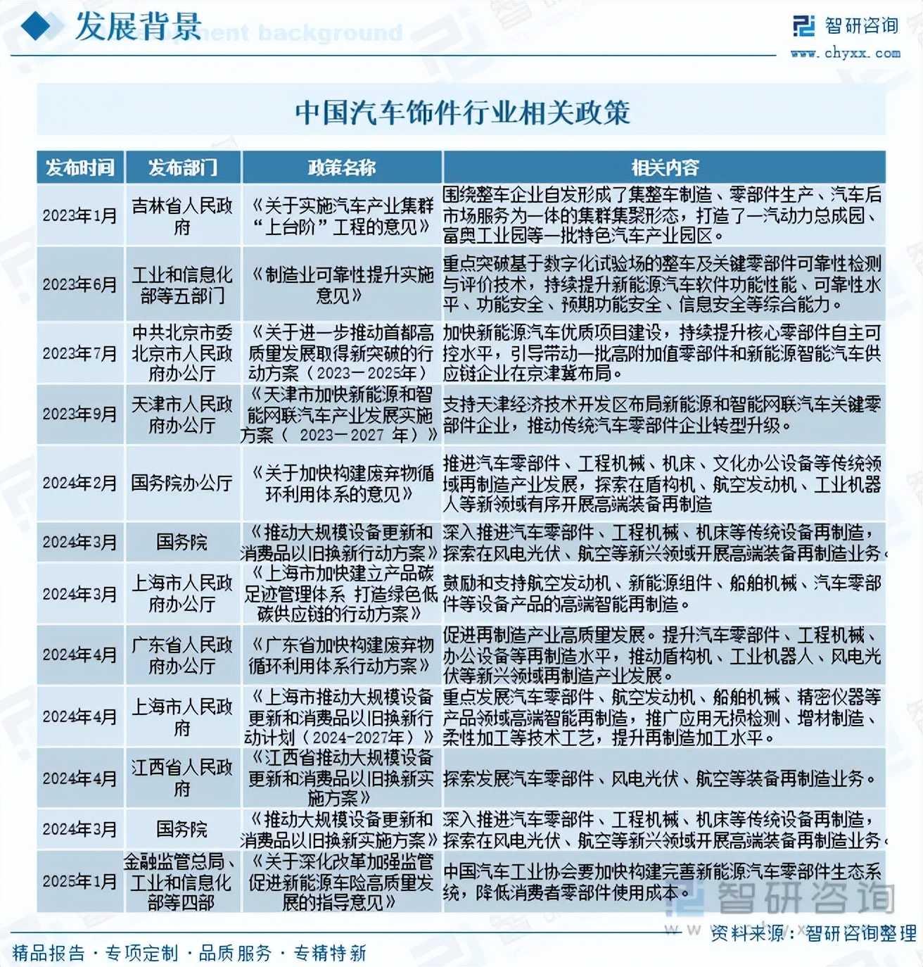 我国高度重视包括汽车饰件在内的汽车零部件产业发展,相继发布《关于实施汽车产业集群“上台阶”工程的意见》、《制造业可靠性提升实施意见》、《关于进一步推动首都高质量发展取得新突破的行动方案(2023—2025年)、《天津市加快新能源和智能网联汽车产业发展实施方案(2023—2027年)》、《关于加快构建废弃物循环利用体系的意见》、《推动大规模设备更新和消费品以旧换新行动方案》、《上海市加快建立产品碳足迹管理体系打造绿色低碳供应链的行动方案》、《广东省加快构建废弃物循环利用体系行动方案》、《上海市推动大规模设备更新和消费品以旧换新行动计划(2024-2027年)》、《江西省推动大规模设备更新和消费品以旧换新实施方案》、《推动大规模设备更新和消费品以旧换新实施方案》、《关于深化改革加强监管促进新能源车险高质量发展的指导意见》等一系列政策支持、鼓励和规范行业发展,为我国汽车饰件行业发展提供了良好的政策环境。
