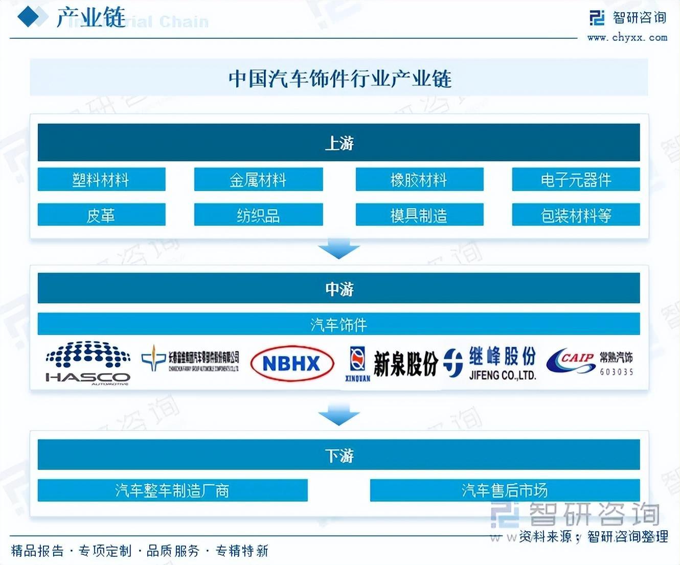 汽车饰件行业上游主要包括塑料材料(聚丙烯、聚氨酯、聚碳酸酯等)、金属材料(钢材、铝材等)、橡胶材料、电子元器件、皮革、纺织品、模具制造等行业;行业中游为汽车饰件生产企业;行业下游主要面向汽车市场,包括汽车整车制造厂商和汽车售后市场,汽车整车制造厂商将汽车饰件零部件组装到整车上,对饰件的质量、匹配性和安装工艺要求极高,而汽车售后服务市场为汽车饰件提供了更换、维修和升级的需求,随着汽车保有量的增加,售后市场对汽车饰件的需求也在逐渐增长。