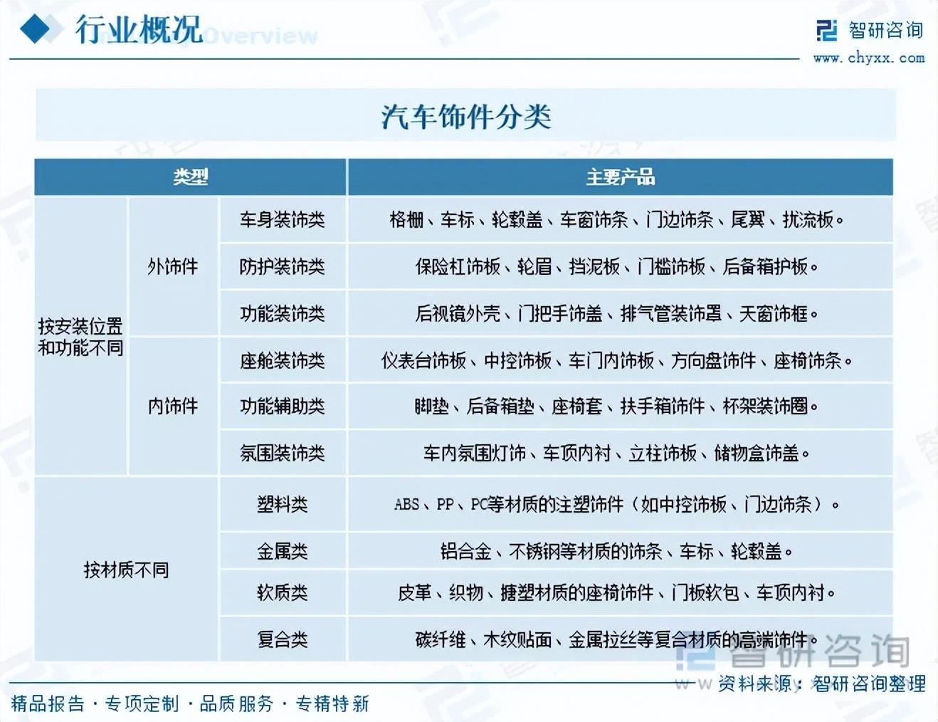 汽车饰件是构成汽车内外视觉形象、保护车身结构或辅助功能实现的零部件集合,材质涵盖塑料、金属、皮革、织物等,既具备装饰属性,也常承担防护、密封、降噪等实用功能。按材质不同,汽车饰件可以分为塑料类、金属类、软质类、复合类等类型;按安装位置和功能不同,汽车饰件可以分为外饰件和内饰件,其中,外饰件又可以分为车身装饰类、防护装饰类和功能装饰类,内饰件又可以分为座舱装饰类、功能辅助类和氛围装饰类。