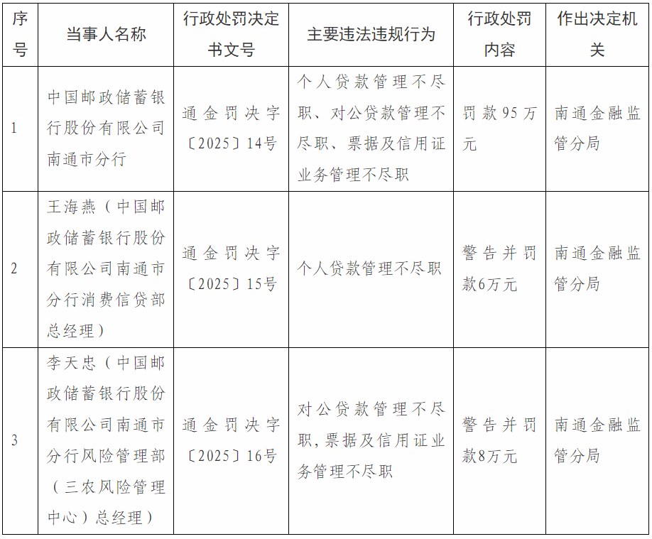 2025年12月8日,国家金融监督管理总局江苏监管局公布行政处罚信息公开表,中国邮政储蓄银行股份有限公司南通市分行(简称“邮储银行南通市分行”)因三项违法违规行为被罚95万元。