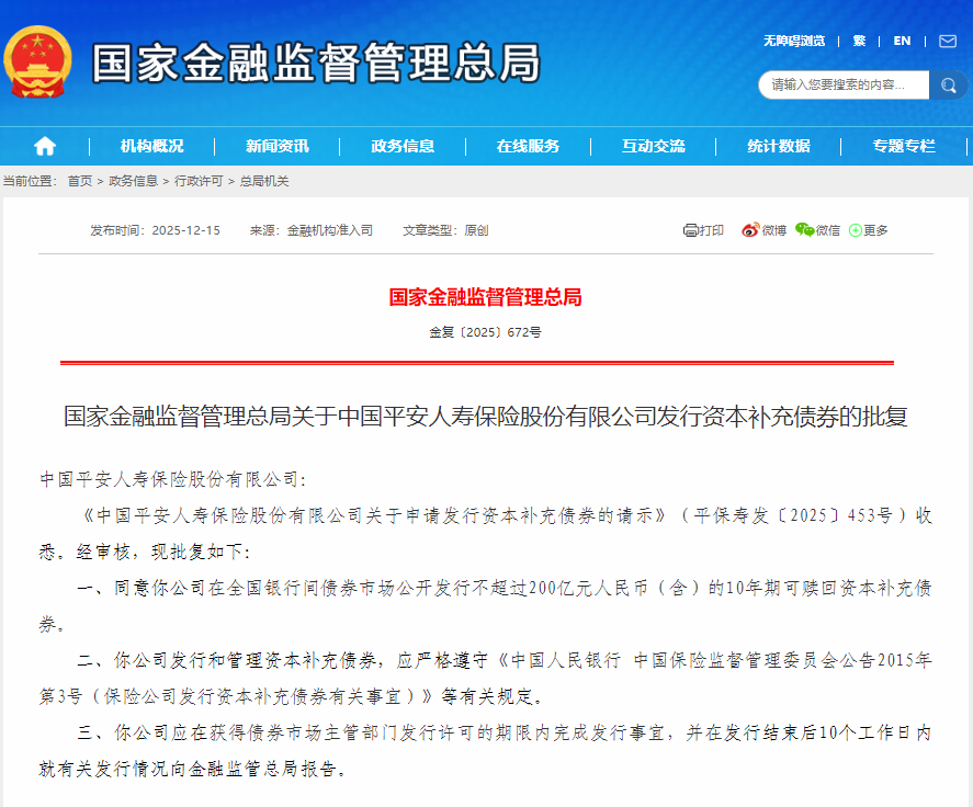 【大河财立方消息】12月15日,国家金融监督管理总局批复,同意中国平安人寿保险股份有限公司在全国银行间债券市场公开发行不超过200亿元(含)的10年期可赎回资本补充债券。