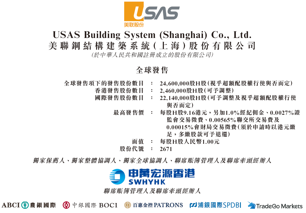 美联股份,计划全球发售2460万股H股(占发行完成后总股份的20.41%),其中90%为国际发售、10%为公开发售,另有15%超额配股权。每股发售价介乎7.10港元~9.16港元,每手300股,入场费2,775.71港元,最多募资约2.25亿港元。