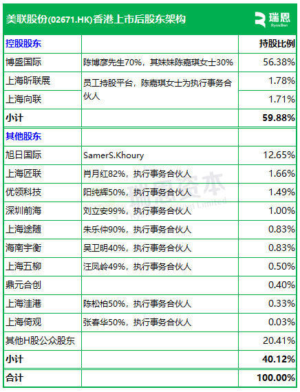 招股书显示,美联股份在香港上市前的股东架构中,陈博彦先生、陈嘉琪女士(陈博彦先生的妹妹)合计持股59.88%,为控股股东。其他公众股东持股40.12%。