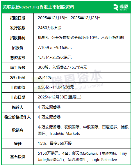 来自上海松江区的美联股份(02671.HK),于今日(12月18日)起至下周二(12月23日)招股,预计2025年12月30日在港交所挂牌上市,申万宏源香港独家保荐。