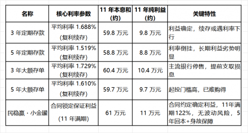 融360数字科技研究院2025年9月的监测数据显示,3年期整存整取平均利率为1.688%,而5年期整存整取平均利率为1.519%;大额存单方面,3年期平均利率为1.729%,5年期平均利率为1.610%。基于融 360 最新监测利率,以 50 万元本金、11 年持有期为标准,按“到期续存”(储蓄类产品)和“合同约定保证利益”(以中国人保APP上的民稳赢 小金罐为例)原则测算,利益如下(注:银行产品假设未来利率维持当前水平,民稳赢 小金罐按合同约定保证利益核算)。