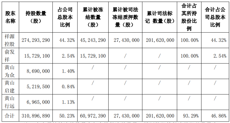 交建股份的情况同样严峻,控股股东祥源控股持有的44.32%公司股份已全部被冻结、标记及轮候冻结。实际控制人俞发祥个人持有的1572.91万股也被全额冻结。