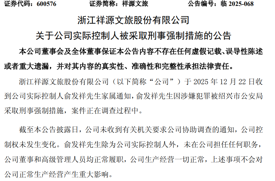 近日,上市公司祥源文旅(维权)、交建股份(维权)、海昌海洋公园接连披露公告,称收到了实际控制人俞发祥先生家属的通知,俞发祥因涉嫌犯罪,已被其家乡——浙江绍兴市的公安局采取刑事强制措施。