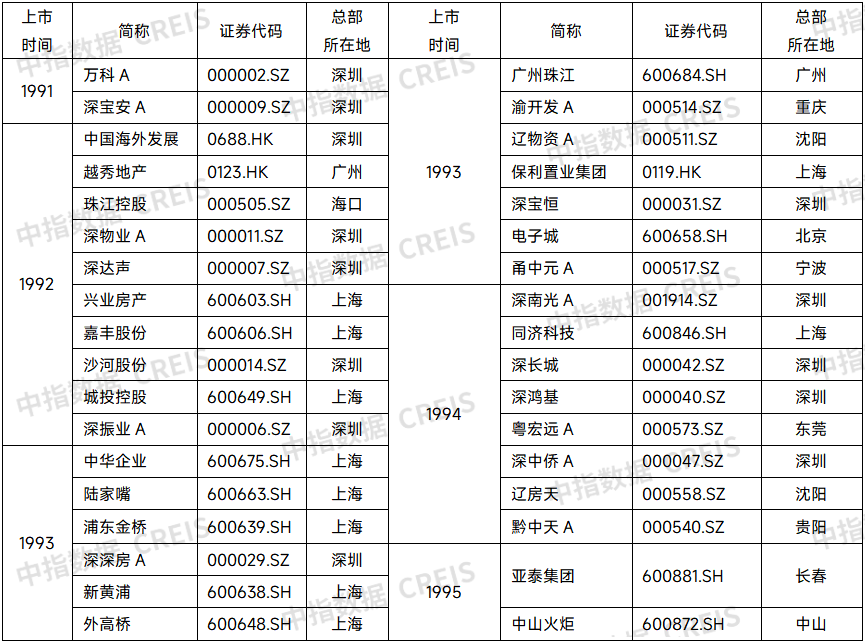 1990年代初,上海、深圳等前沿开放城市的国有房地产企业抓住房地产市场化初期发展机遇,本地化经营,先行在内地和香港上市。1990年沪深交易所成立并营业。1991年,房地产企业如万科、深宝安A先后上市,1992年中海地产、越秀地产、沙河股份、城投控股等陆续上市。上海、深圳属于中国改革开放的前沿阵地,并且这两个城市均设有证券交易所,房地产市场化发展也较早,政府鼓励当地国企房地产公司发展,所以初期上市房地产公司多属于上海、深圳的国企。1995年,沪深两市及内地在港上市的房地产上市房企数量达到35家,其中A股上市房企32家,占A股总上市企业数量的9.9%。2004年,A股、H股上市房企合计达到90家,其中A股79家,占A股总上市企业数量的5.7%。