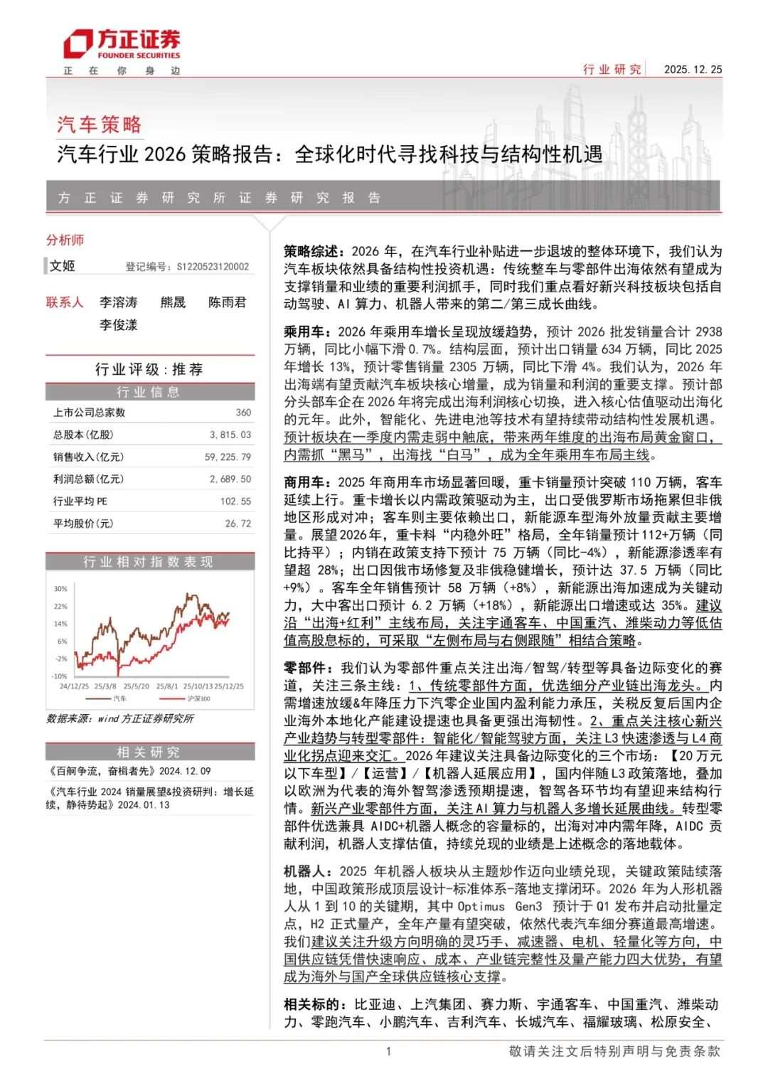 本文来自方正证券研究所于2025年12月26日发布的报告《汽车行业2026策略报告:全球化时代寻找科技与结构性机遇》,欲了解具体内容,请阅读报告原文。