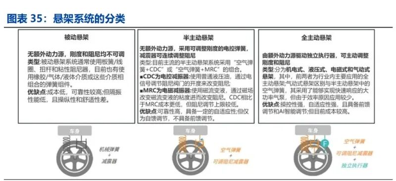智能汽车悬架技术的发展呈现出从被动到主动,从机械到电控,从单一到集成的演进路径,核心目标是极致优化驾乘体验。 1)半主动悬架是当前主流和普及方向:“空气弹簧+CDC/MRC”是典型代表,已成中高端车型主流配置。它通过电控信号连续、自适应地调节阻尼(CDC/MRC)和刚度(空气弹簧),良好的平衡了成本与性能。 2)全主动悬架是下一阶段的发展趋势:其通过独立的动力源和执行器,能够主动向车轮施加力,而非仅仅被动调节。这使得车辆可以实现如“跳舞”、预判路况提前调整、极致抑制侧倾/俯仰等高级功能,是实现完全智能驾驶体验的重要组成部分。3)智能化与集成化是未来终极趋势:悬架系统与摄像头、雷达、导航、车身稳定系统 ESC 等整车其他系统的深度集成,通过预瞄系统提前感知路况,或根据导航信息提前调整悬架状态,将能实现真正意义上的“主动”和“智能”。预计空悬等高级配置在国产供应链推动下将加速普及,市场竞争格局将由外资主导演变为中外企业在各细分领域激烈竞合、共同推动技术下沉的新局面。空气悬架正加速从百万级豪华车下探至 30 万元级别国产新能源车型,主要得益于:规模效应与成本下降、技术国产化突破、电动车底盘结构优势、品牌差异化竞争需求。当前智能悬架核心技术掌握在奔驰、奥迪、大陆、VC、采埃孚、舍弗勒等国外主机厂和供应商手中,而以保隆科技、拓普集团、孔辉等为代表的国内供应商发展迅猛,开始逐渐量产配套半主动空气悬架,国内部分主机厂也开始自主开发和量产控制系统。
