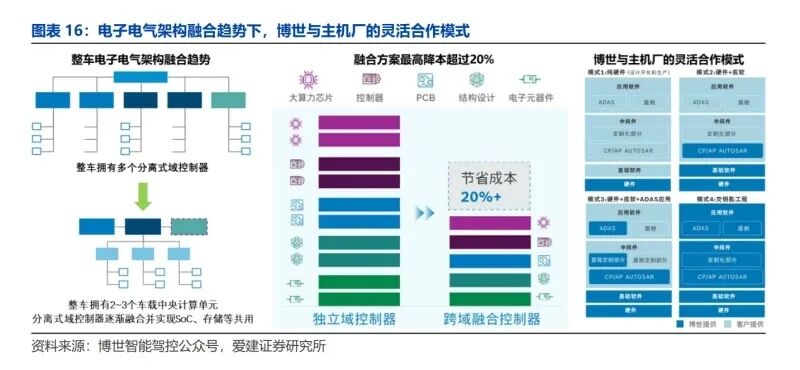 成本导向是跨域融合的主要驱动力。融合多种功能域的控制器有机会在硬件电路、散热系统、外壳封装方面做集成设计,由此整个系统成本将得到优化提升。跨域融合控制器在系统响应性能方面也有机会得到提升,制动等需要快速反应的功能将受益。业务合作模式灵活的域控制器供应商有望获取更多项目机会。在跨域融合发展趋势的共识下,能力较强的主机厂长期将会选择自研,而能力相对较弱的主机厂将选择供应商方案。主机厂的需求会因自身能力细节的差异和所处发展阶段的不同而异。以博世为代表的供应商则会结合主机厂的不同需求状态进行灵活的定制化配套服务,这样的合作模式将满足更多主机厂不同的产品开发需求。