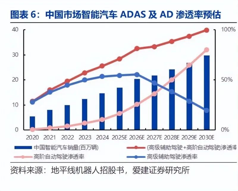 预计 2026 年高阶自动驾驶渗透率开始加速提升,L4-L5 或在2027-2028年开始实质突破。根据地平线招股书,2026 年高级辅助驾驶渗透率出现下降的拐点,同时高阶自动驾驶的渗透率逐步加速提升。到 2027 年,中国乘用车部署的驾驶自动化解决方案中将有接近一半是高阶自动驾驶解决方案。到 2030 年,此比例将进一步提高到80%以上,快于高阶自动驾驶解决方案在全球市场的渗透速度。根据如祺出行招股书,预计中国市场 L2-L3 级别自动驾驶车辆的渗透率在 2025 年有望超过60%,在2026年接近 70%后增速趋缓,L4-L5 级别自动驾驶在 2026-2027 年开始逐步加速渗透,在2027-2028 年有望越过 5%。我们预计部分车企及系统级供应商掌握“算力+算法+数据”以及对应工具链且智驾方案具备系统性降本潜力,这将成为推动高阶智驾渗透率持续提升的关键驱动力。