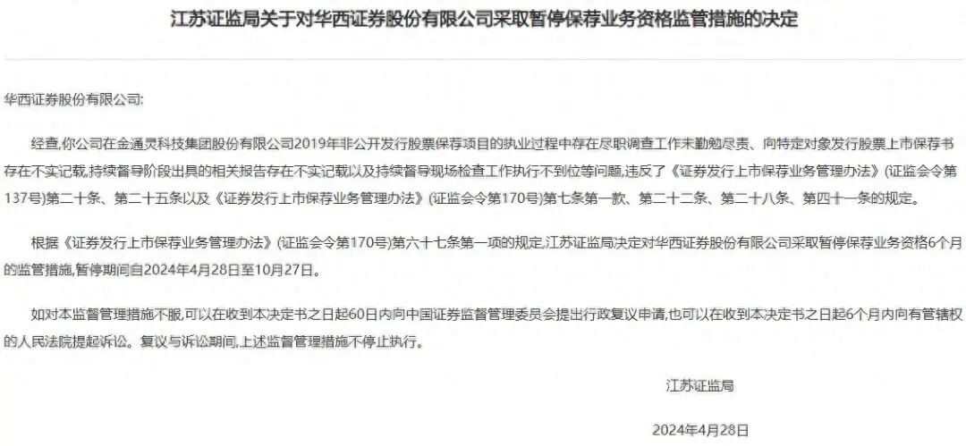 作为金通灵2019年非公开发行股票保荐项目的保荐机构,华西证券因在执业过程中存在多项违规行为,于2024年4月28日被江苏证监局作出暂停保荐业务资格6个月的决定,具体违规情形包括尽职调查未勤勉尽责、向特定对象发行股票上市保荐书存在不实记载、持续督导阶段相关报告不实以及现场检查执行不到位等。