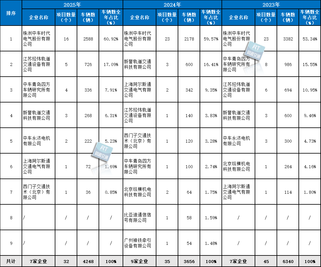 据RT轨道交通统计,2025年,共有7家企业分食32个牵引系统的中标项目,分别是株洲中车时代电气股份有限公司、江苏经纬轨道交通设备有限公司、中车青岛四方车辆研究所有限公司、新誉轨道交通科技有限公司、中车永济电机有限公司、上海阿尔斯通交通电气有限公司、西门子交通技术(北京)有限公司。