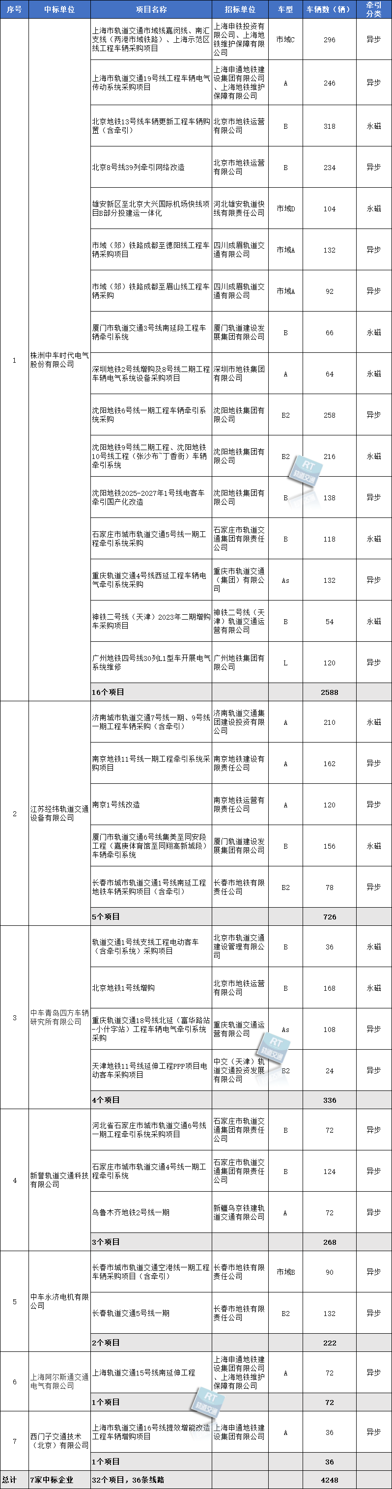 2025年共有15座城市发布了32个城轨牵引系统中标项目,涉及36条线路(含16条新建线路、11条延长线路、6个增购项目和4个改造项目),中标牵引系统车辆数合计为4248辆,中标企业为7家。