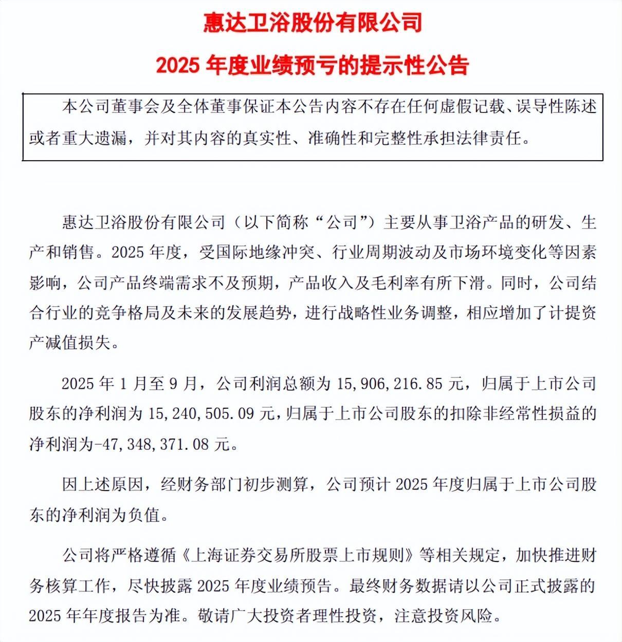 惠达卫浴结合行业的竞争格局及未来的发展趋势,进行战略性业务调整,相应增加了计提资产减值损失。2025年1月至9月,公司利润总额为15,906,216.85元,归属于上市公司股东的净利润为15,240,505.09元,归属于上市公司股东的扣除非经常性损益的净利润为-47,348,371.08元。因上述原因,经财务部门初步测算,公司预计2025年度归属于上市公司股东的净利润为负值。