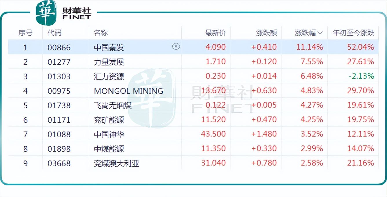 截至发稿,港股中,$中国秦发(HK0866)大涨11.14%,$力量发展(HK1277)涨7.55%,$MONGOL MINING(HK0975)涨4.83%,兖矿能源(01171.HK)涨4.25%,中国神华(01088.HK)涨3.52%,中煤能源(01898.HK)涨2.99%,兖煤澳大利亚(03668.HK)涨2.58%。
