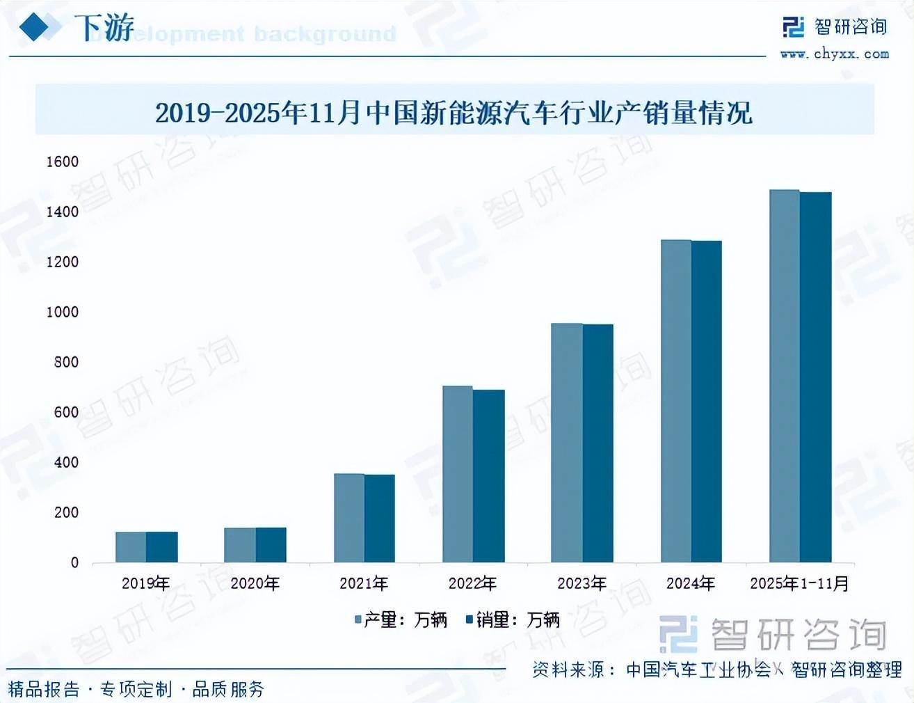 在环境问题日趋严重的背景下,新能源汽车的发展得到了我国政府的政策扶持。近年来,我国接连出台了一系列鼓励政策,如《空气质量持续改善行动计划》《关于2026—2027年减免车辆购置税新能源汽车产品技术要求的公告》等,直接刺激了新能源汽车行业的发展。数据显示,2019-2024年中国新能源汽车行业产销量呈现快速上升趋势;2025年1-11月中国新能源汽车产量达到1490.7万辆,销量达到1478万辆,分别同比上涨31.40%,31.20%。随着新能源汽车的持续发展,对轻量化、高效能的需求持续增加,促使车企优先选择线控底盘以优化能耗与续航。因此,随着新能源汽车产销量增加,线控底盘需求将不断上涨。