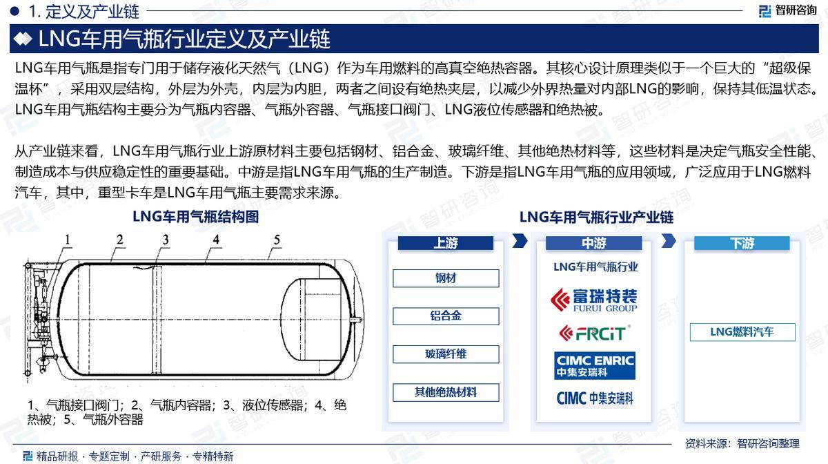 产业链:从产业链来看,LNG车用气瓶行业上游原材料主要包括钢材、铝合金、玻璃纤维、其他绝热材料等,这些材料是决定气瓶安全性能、制造成本与供应稳定性的重要基础。中游是指LNG车用气瓶的生产制造。下游是指LNG车用气瓶的应用领域,广泛应用于LNG燃料汽车,其中,重型卡车是LNG车用气瓶主要需求来源。