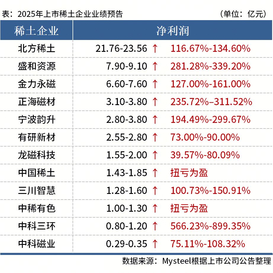 据Mysteel不完全统计,截至2026年2月4日,北方稀土、盛和资源、金力永磁等12家上市稀土企业披露2025年度业绩预告,且全部预喜。其中,中科三环净利润增幅最大,同比增长566.23%-899.35%;盛和资源净利润增幅位居第二,同比预增281.28%-339.20%。具体如下: