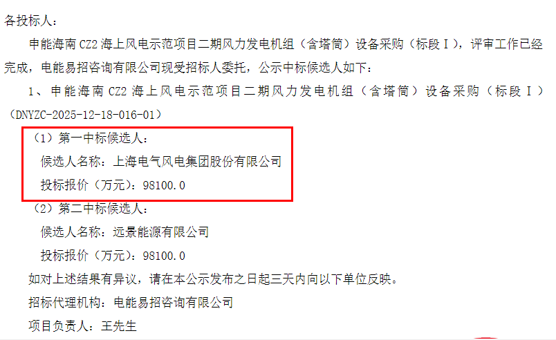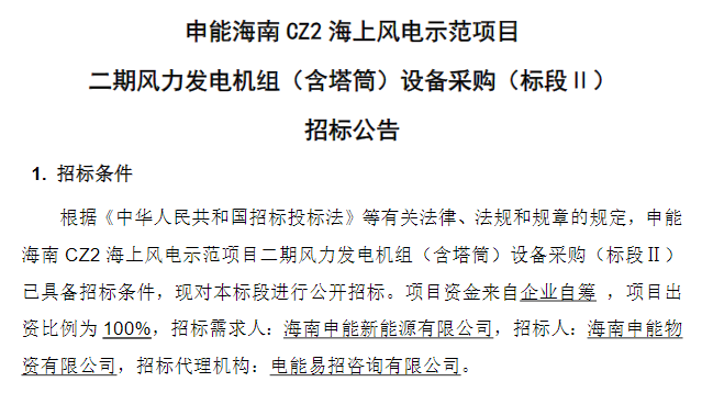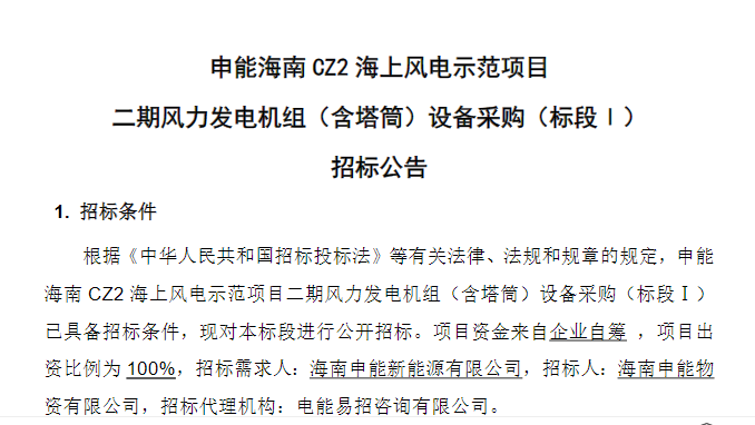 申能海南 CZ2 海上风电示范项目二期风力发电机组(含塔筒)设备采购(标段I)中标候选人公示