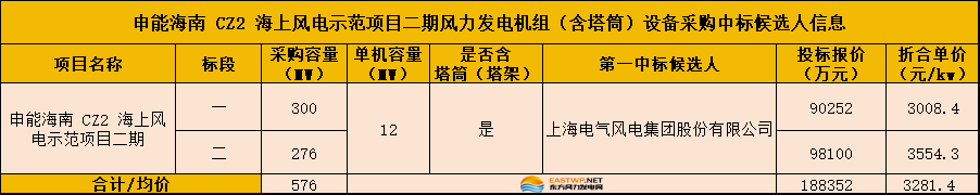 东方风力发电网讯:2月4日,国家电投电子商务平台连续发布《申能海南 CZ2 海上风电示范项目二期风力发电机组(含塔筒)设备采购(标段I)中标候选人公示》《申能海南 CZ2 海上风电示范项目二期风力发电机组(含塔筒)设备采购(标段II)中标候选人公示》,公告显示项目两标段总容量576MW,上海电气独揽,总报价188352万元。
