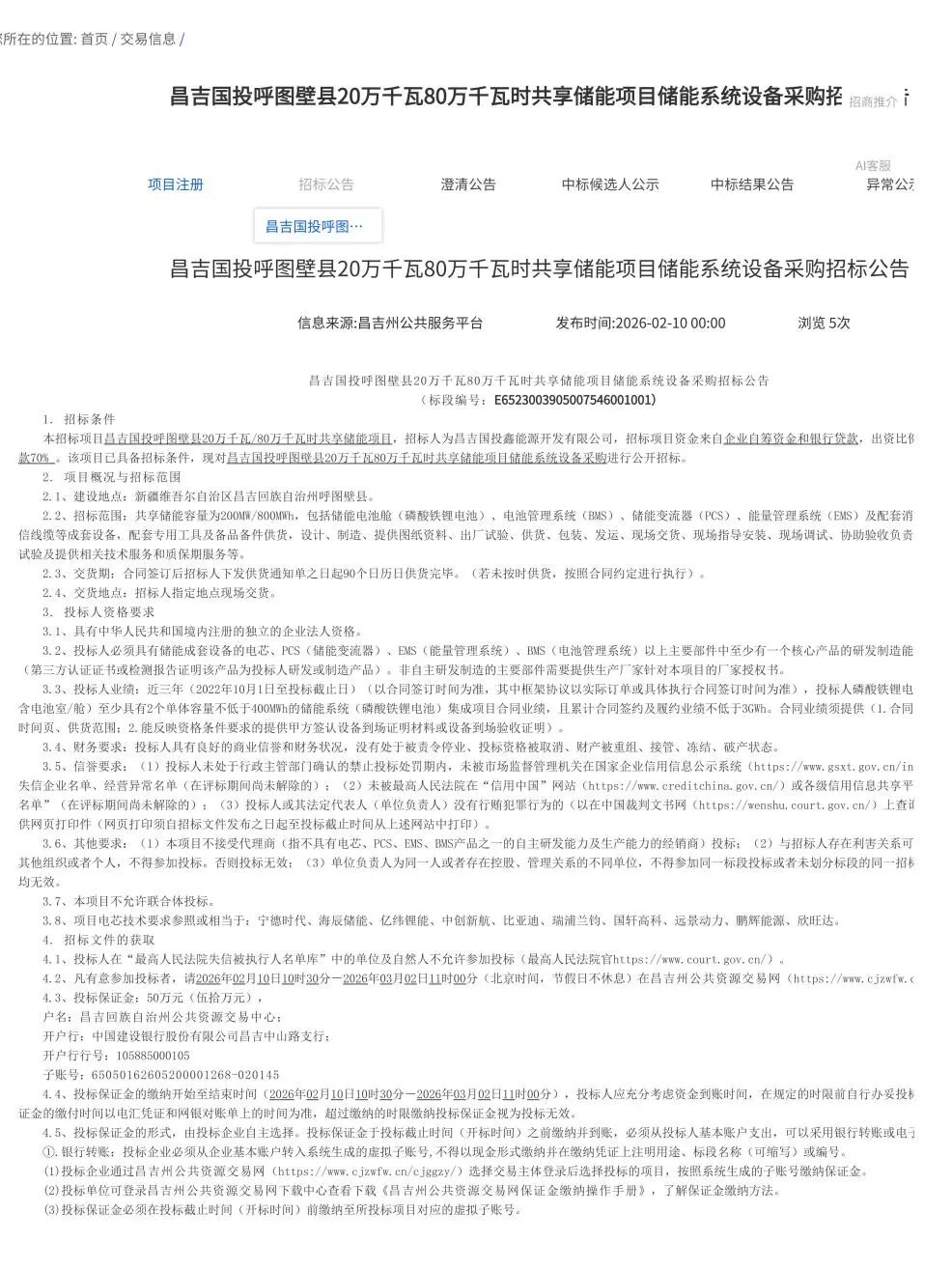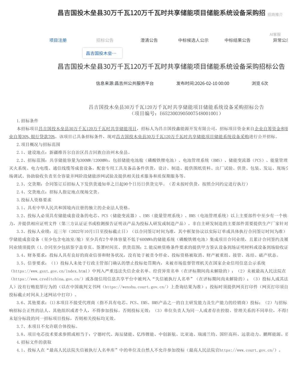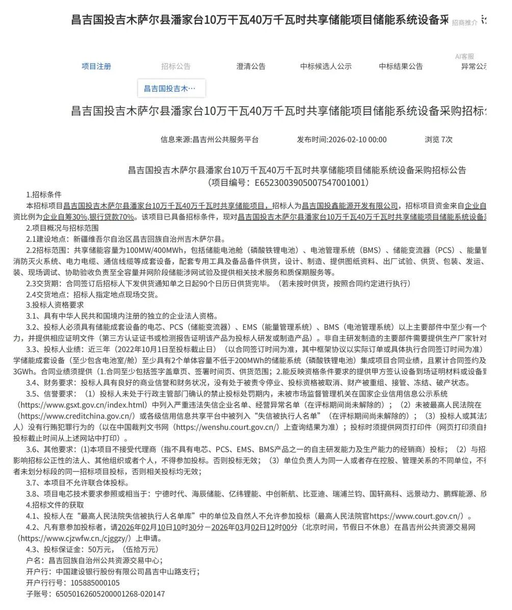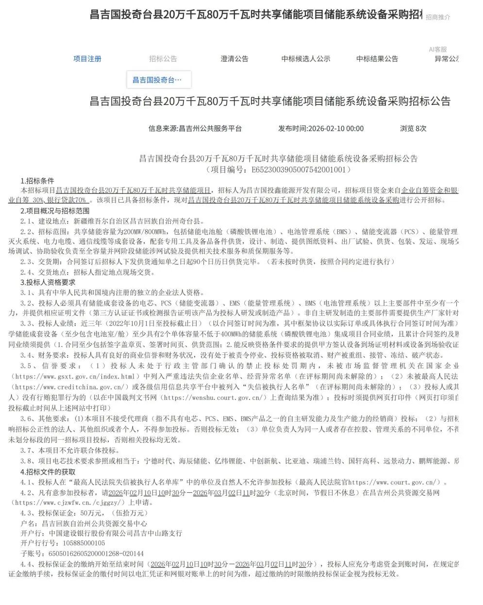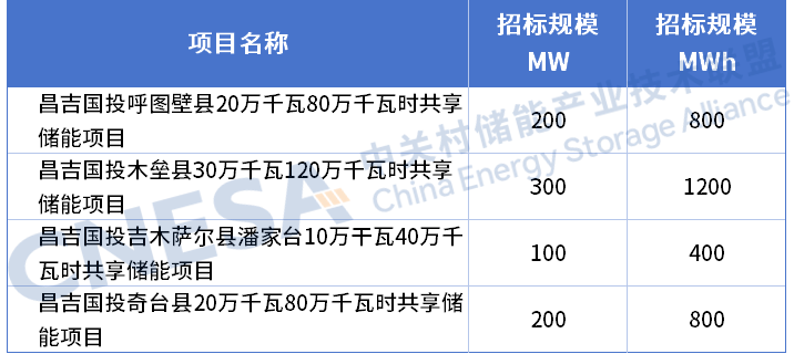 2月10日,昌吉国投鑫能源开发有限公司发布四个共享储能项目储能系统设备采购招标,总规模800MW/3.2GWh。