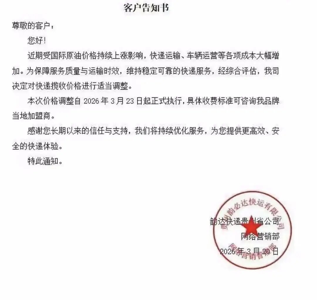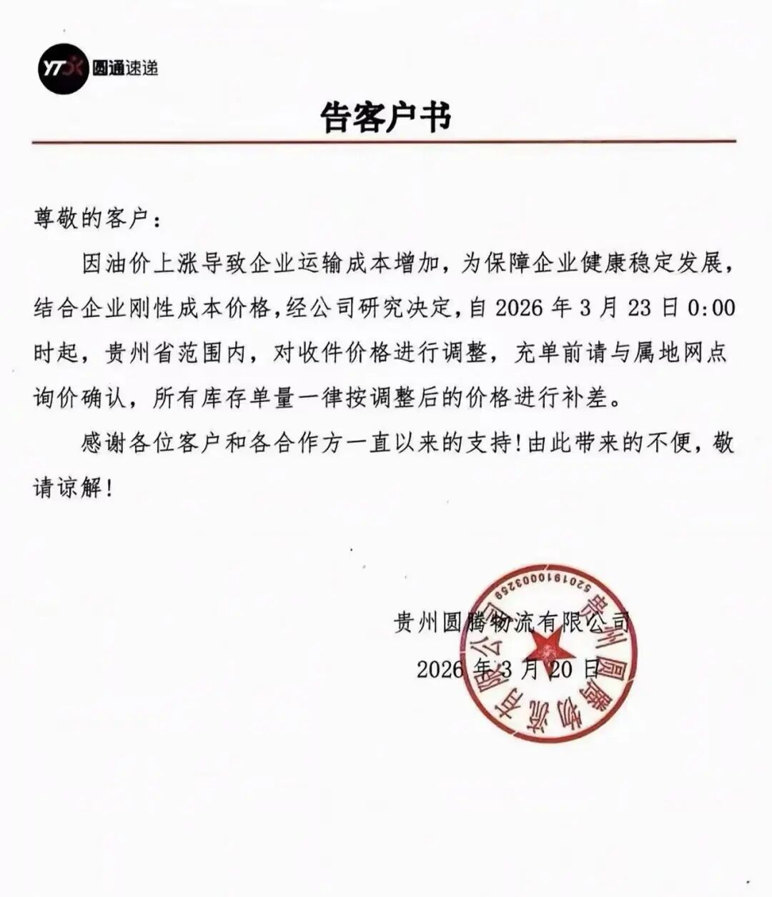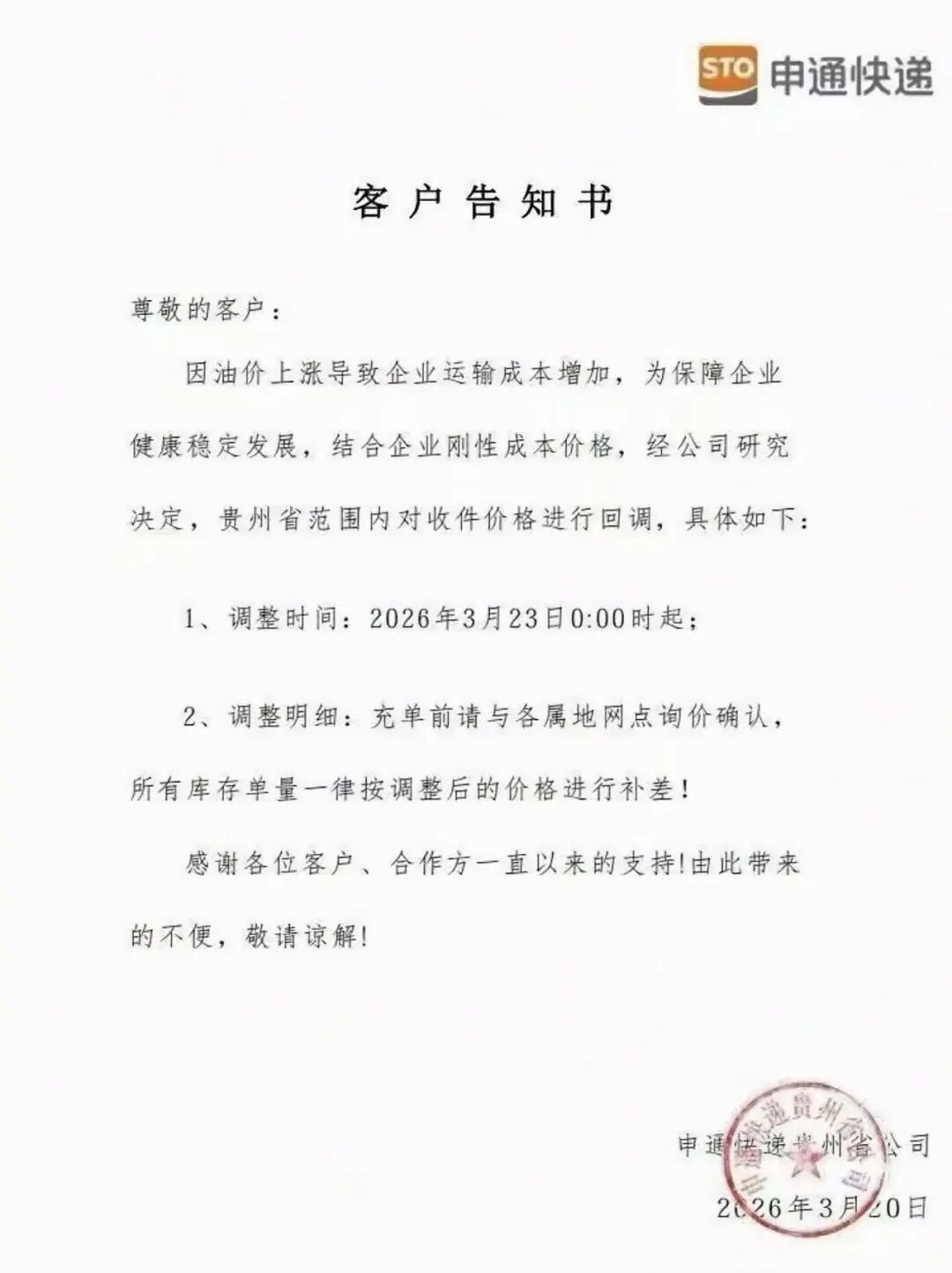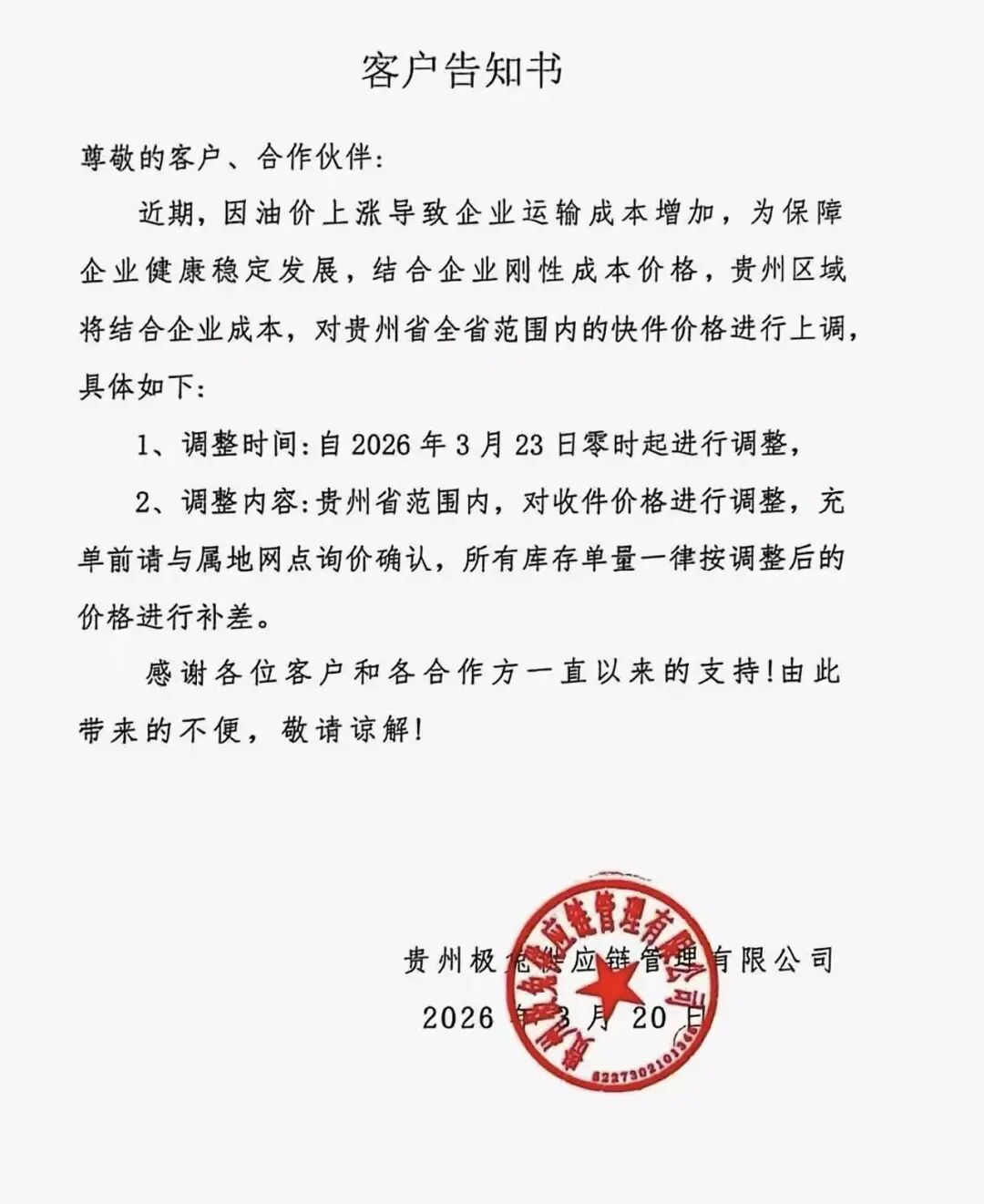 因油价上涨导致企业运输成本增加,为保障企业健康稳定发展,结合企业刚性成本价格,经公司研究决定,自2026年3月23日0:00时起,贵州省范围内,对收件价格进行调整,充单前请与属地网点询价确认,所有库存单量一律按调整后的价格进行补差。