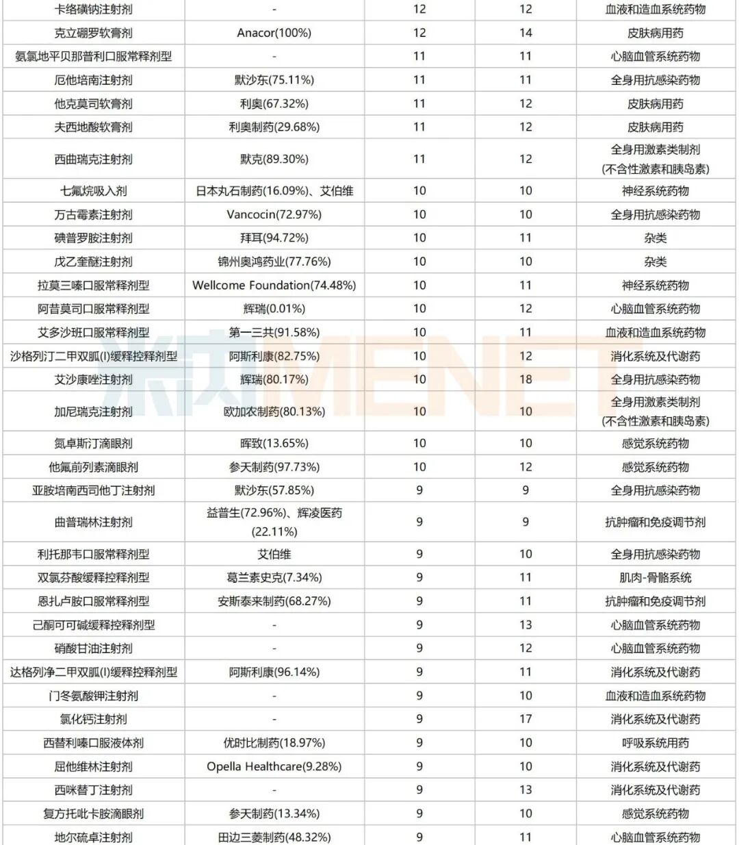 日前,国家医保局发布《通过一致性评价企业数较多且尚未纳入国家组织集采的药品》,被业界视为第十二批国采的候选品种名单。151个品种在列,2025年在中国公立医疗机构终端的销售额合计超过1000亿元。若以米内网最新数据(截至今年3月)看,17个品种火爆(达20家及以上),倍特、齐鲁、科伦等数量领跑。