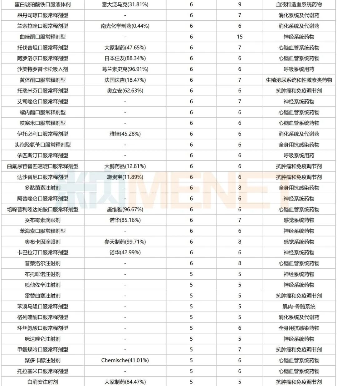 从治疗领域看,151个品种涵盖13个治疗大类,集中在消化系统及代谢药、心脑血管系统药物、神经系统药物、抗肿瘤和免疫调节剂、全身用抗感染药物等,涉及的品种数分别达24个、21个、19个、18个、16个,占比均超过10%。