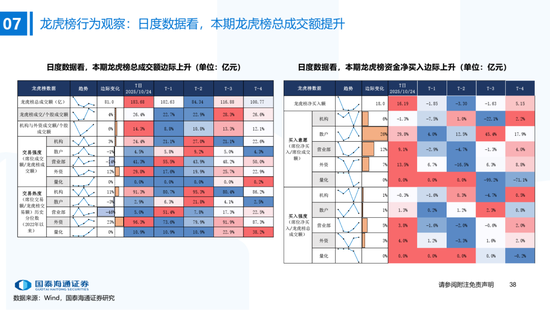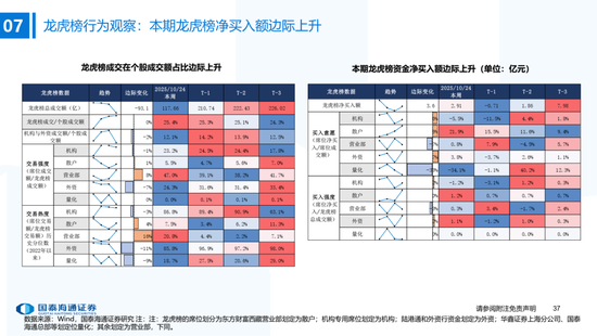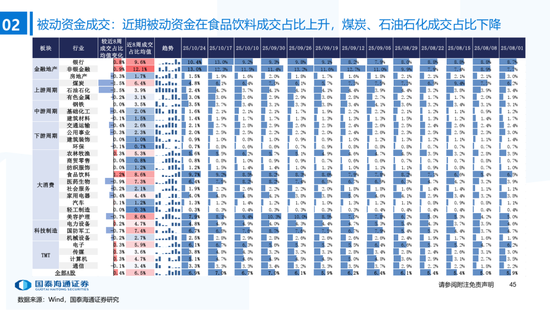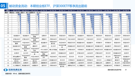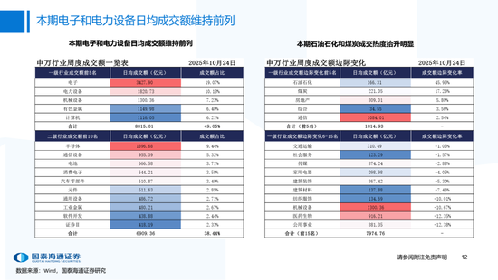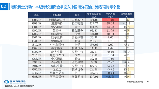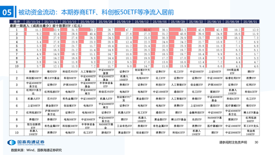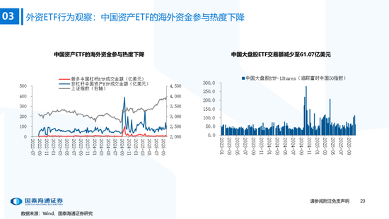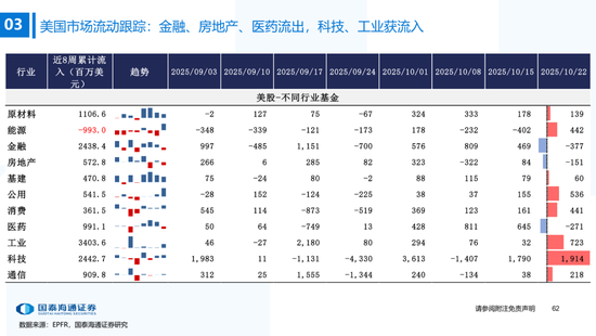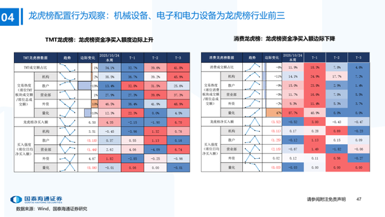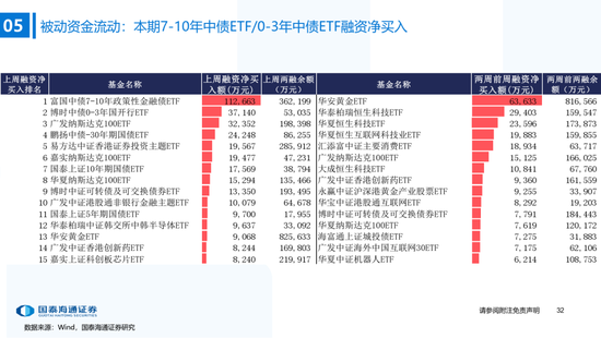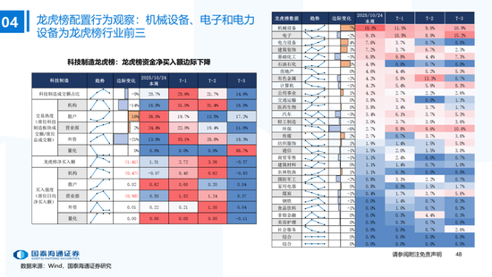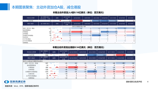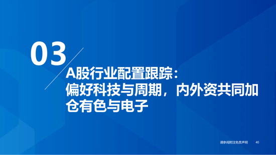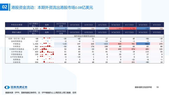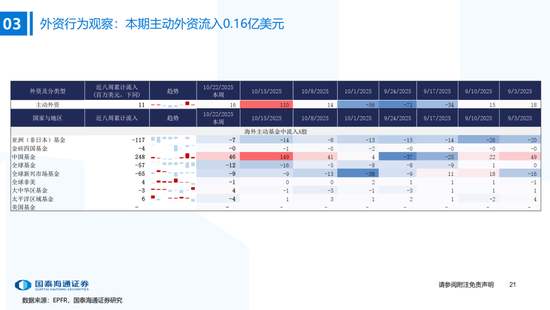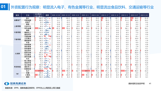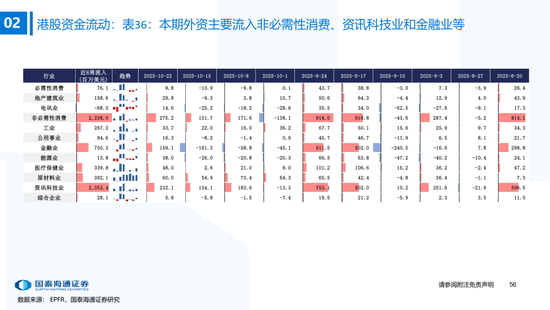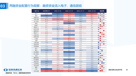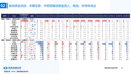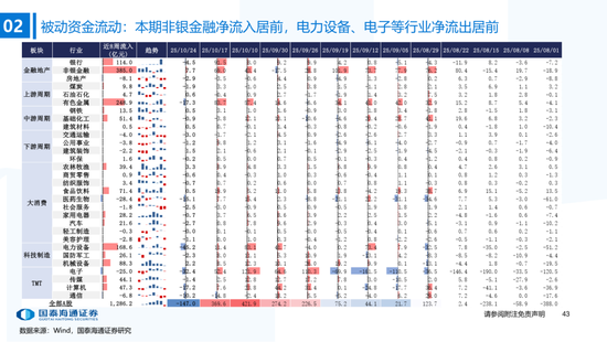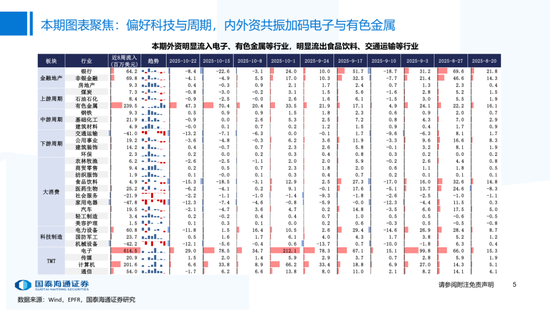 ▶A股行业配置:偏好科技与周期,内外资共振加码电子与有色金属。1)外资:(截至10/22)有色金属(+47.3百万美元)/电子(+29.0百万美元)净流入居前,食品饮料(-15.3百万美元)/交通运输(-13.2百万美元)净流出;2)融资:(截至10/23)电子(+82.3亿元)/通信(+34.2亿元)净流入居前,有色金属(-14.3亿元)净流出;3)ETF:一级行业被动资金流动行为集中,非银(+7.7亿元)净流入居前;二级行业中证券/中药净流入居前;电力设备(-45.2亿元)/电子(-32.4亿元)净流出居前,二级行业中电池/半导体净流出居前。本期增持居前的ETF包括券商ETF/科创板50ETF等,7-10年中债ETF /0-3年中债ETF融资净买入居前;创业板ETF/沪深300ETF净赎回居前,中证海外互联ETF/恒生科技ETF融资净卖出;4)龙虎榜资金:机械设备、电子和电力设备为龙虎榜行业前三。