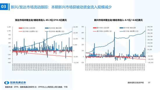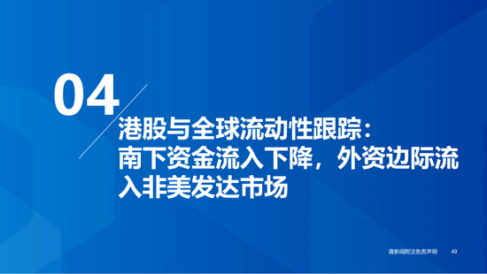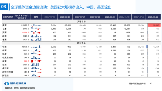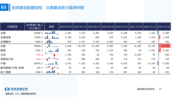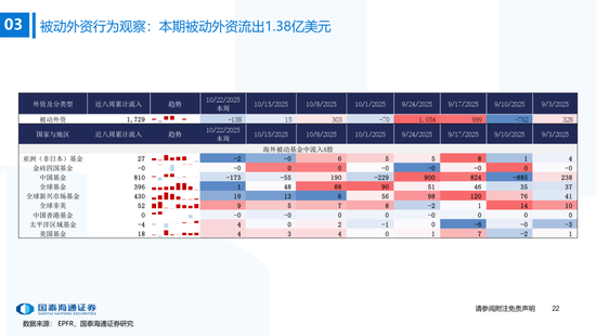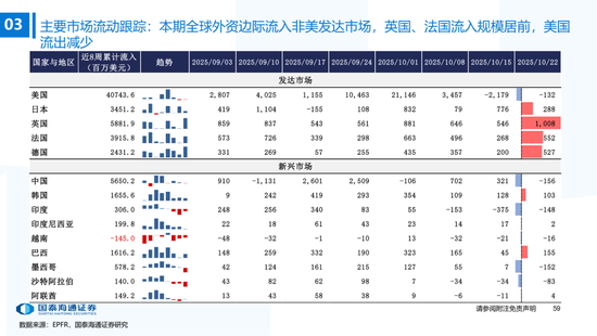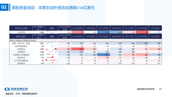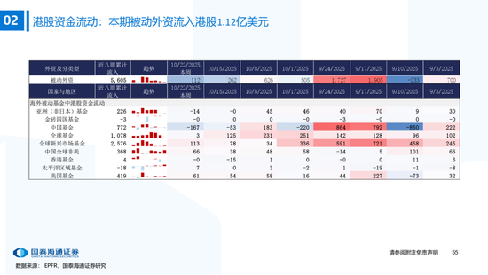▶港股与全球资金流动:南下资金流入下降,外资边际流入非美发达市场。本期恒生指数收涨3.6%,全球主要市场全线上涨,韩国综指(+5.1%)涨幅居前。资金维度:1)南下资金单周净买入升至172.8亿元,处2022年以来59%分位(MA5);2)本期(截至10/22)发达市场主动/被动资金净流动-65.3亿/218.8亿美元,新兴市场主动/被动资金净流动-6.1亿/-6.6亿美元。仅外资口径看,本期全球外资边际流入非美发达市场,英国(+10.1亿美元)和法国(+5.5亿美元)获流入居前,美国(-1.32亿美元)继续流出。含各国内资的全球整体流动看,美国获流入居前,中国/英国流出。北美基金获大幅净申购,美股科技/工业基金净申购居前。