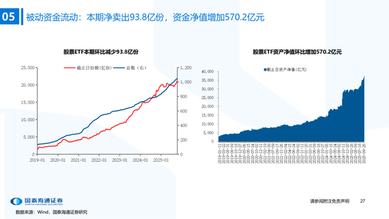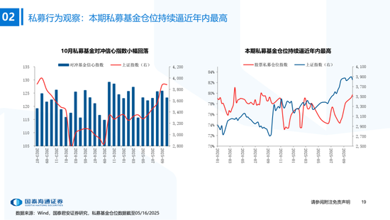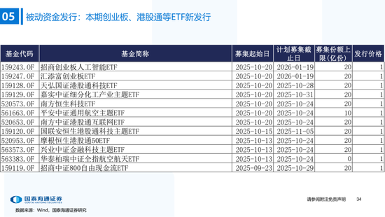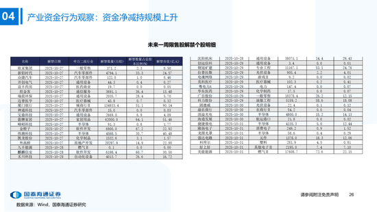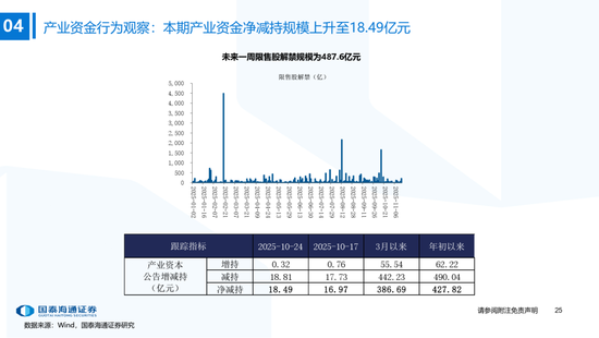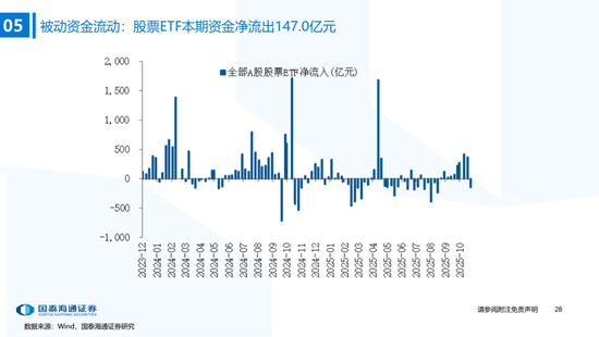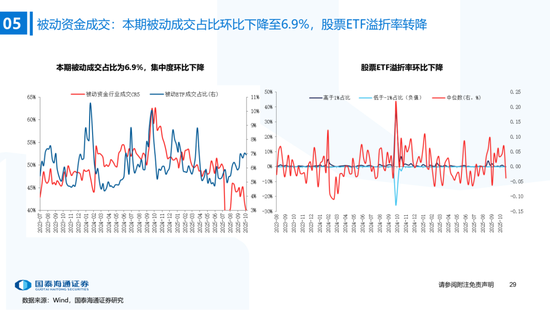 ▶A股资金流动:偏股基金发行边际抬升,融资资金加速。1)公募:本期偏股基金新发规模上升至121.5亿,各类公募基金股票较上期减仓;2)私募:10月私募信心指数小幅下降,仓位持续逼近年内最高(截至10/17);3)外资:流出1.2亿美元(截至10/22),北向资金成交占比历史分位数升至38.7%;4)产业资本:本期IPO首发募集25.4亿元,定增规模为211.51亿元,限售股解禁规模487.6亿元;5)ETF:被动资金骤转为净流出,净流出147.0亿元,被动成交占比环比下降至6.9%,股票ETF溢折率有所下降;6)融资:本期净买入210.9亿元,成交额占比下降至11.0%;7)散户:另类指标显示本期散户活跃度边际抬升。