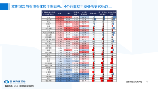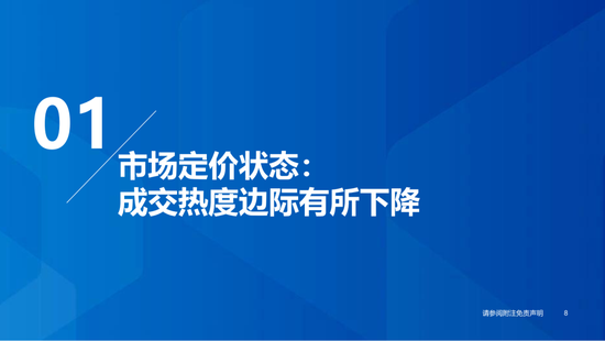 ▶市场定价状态:本期市场成交热度有所下降。1)市场情绪(下降):本期市场交易换手率降低,全A日均成交额下降至1.8万亿,日均涨停家数升至73.2家,最大连板数为7个,封板率上升至78.6%,龙虎榜上榜家数下降至59家;2)赚钱效应(上升):本期个股上涨比例提升至81.2%,全A个股周度收益中位数上升至3.1%;3)交易集中度(下降):行业交易集中度回落,本期行业换手率历史分位数处于90%以上的行业有4个,其中煤炭、石油石化2个行业换手率处于95%以上。