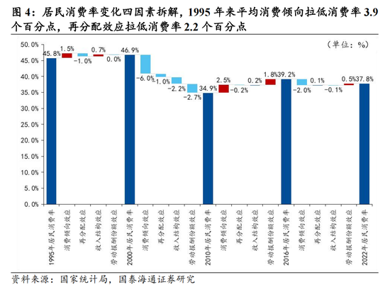 2、四因素拆解显示,1995年以来中国居民消费率累计下降8个百分点,背后的原因及其贡献分别为: