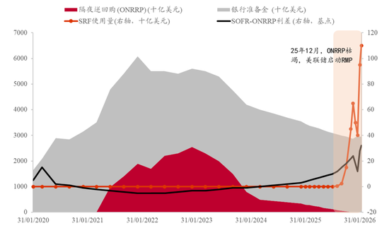 从流动性角度来看,当下或许不具备缩表条件。2025年12月,隔夜逆回购流量逐渐枯竭,26年的货币市场流动性已出现偏紧的状态。如图所示,26年以来,ONRRP(隔夜逆回购)降至接近零,SOFR-ONRRP息差升至32bp历史高位,SRF(常备回购便利)使用量也不断攀升。这或标明银行间流动性或已经转向“略显紧缺”。