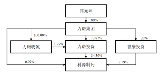 科源制药由力诺集团直接持股0.09%,力诺投资持股34.39%。高元坤通过力诺集团、力诺投资控制科源制药34.48%的股权。高元坤担任科源制药董事,且上市公司4名非独立董事中3名均在力诺集团或其下属企业任职。