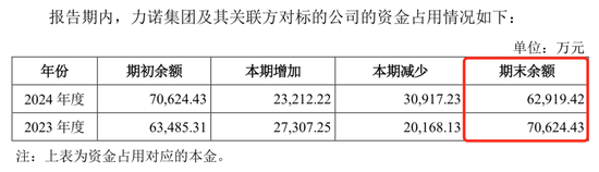其五,资金占用问题。截至2024年末,力诺集团及下属企业对宏济堂的非经营性资金占用本金达6.29亿元。2023年年末时为7.06亿元,此内控缺陷亦是被重点问询事项。
