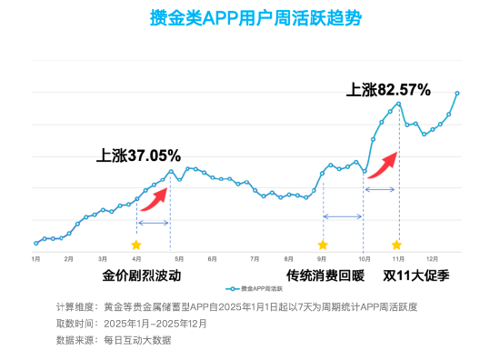每日互动大数据洞察显示,攒金类APP的月新增用户数在4月与10月呈现显著峰值。这一趋势与行业观察高度吻合:4月的增长主要由国际金价快速上涨引发的投资需求及随之提升的媒体关注度驱动;而10月的增长则体现了市场回调后,凭借节后市场企稳与平台营销活动所形成的韧性反弹。整体表明,攒金类应用的用户增长具有明显的季节性,且对金价波动较为敏感。