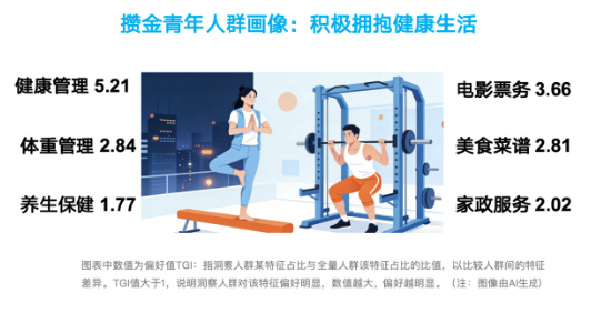 攒金青年对自身生活品质的提升上有着相当的追求,除了购物品质,也体现在对自己健康的要求上。每日互动大数据洞察显示,攒金青年对健康管理、体重管理类APP的相关TGI值分别达到5.21、2.84;对日常生活的品质要求也相对较高,如在美食菜谱方面的TGI达到了2.81。
