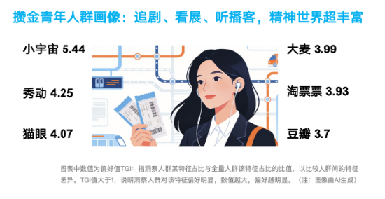 我们也对攒金青年的兴趣偏好进行了洞察。每日互动大数据洞察显示,攒金青年也有丰富的精神世界:他们对于票务类APP,如猫眼、大麦等APP的TGI值均接近4倍于全量青年群体;对播客类APP(如小宇宙)的偏好高达5.44。