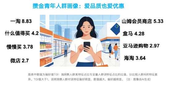 此外,攒金青年对商品优惠返利以及高品质类的购物关注度也较高。每日互动大数据洞察显示,攒金青年对一淘、什么值得买、慢慢买、微店的偏好TGI值分别是8.83、4.2、3.78、2.7。在关注商品优惠的同时,他们对商品的品质要求也相对较高,如攒金青年对于山姆会员商店偏好的TGI值达到了5.33。