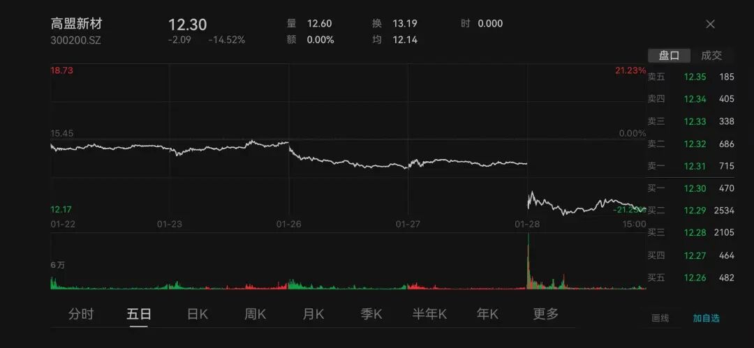 高盟新材:大跌14.52%,盘中最多跌了近17%,一天之内市值蒸发超7亿元;