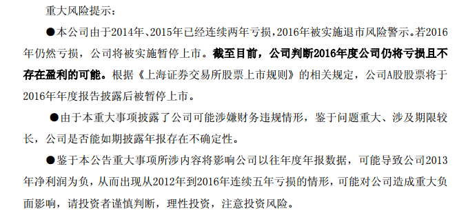 事实上,对财务造假的情况进行追溯重溯后,公司2012年至2017年连续六年亏损。证监会在查实相关事实后,对公司及有关责任人进行了行政处罚,上交所也相应给予了纪律处分。违法违规行为让公司在巨大经营压力之外又添风险。