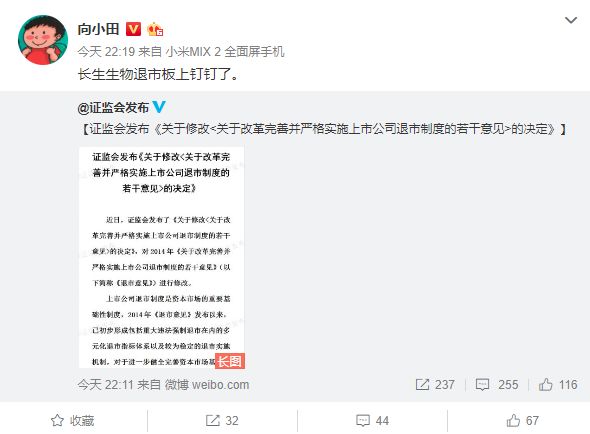 27日晚上10点左右,证监会通过官网发布了《关于修改<关于改革完善并严格实施上市公司退市制度的若干意见>的决定》。从内容上看,这次修改的部分规定堪称为长生生物“量身定做”。
