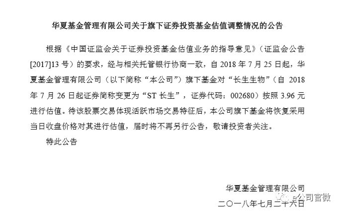 下调幅度最大的是华夏基金,公告自7月25日起,对ST长生按照3.96元进行估值,约还有19个跌停。