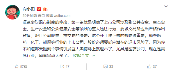 这次对退市制度的修改完善,对于进一步健全资本市场功能,增强市场主体活力,塑造理性投资文化,形成优胜劣汰的良好机制具有重要意义。对有关重大违法公司,特别是严重危害市场秩序,严重侵害群众利益,造成重大社会影响的,坚决依法实施强制退市。