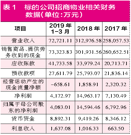 交易草案披露,招商物业2019年1~3月营业收入只有7.27亿元,若按四个季度年化计算,全年营业收入将达到29.09亿元,这跟2018年31.3亿元营业收入相比不但没有出现增长,相反还有所减少。同理,将招商物业2019年1~3月的净利润4172.97万元年化计算则有1.67亿元,和2018年净利润相比,只增长了11.55%。